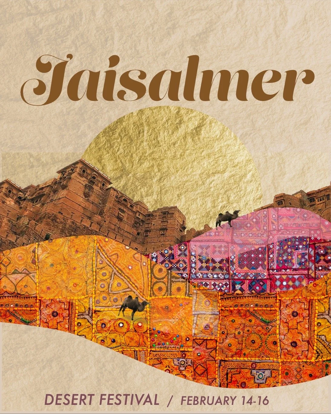 I designed a poster for the Jaisalmer festival. In this poster, I tied in the heritage of the community and some of what the festival represents and looks like. I wanted to have all this beautiful fabric and include camels, as at the festival camels are elaborately decorated! This was a project I made revisions to after print, so you can see my original design towards the bottom.